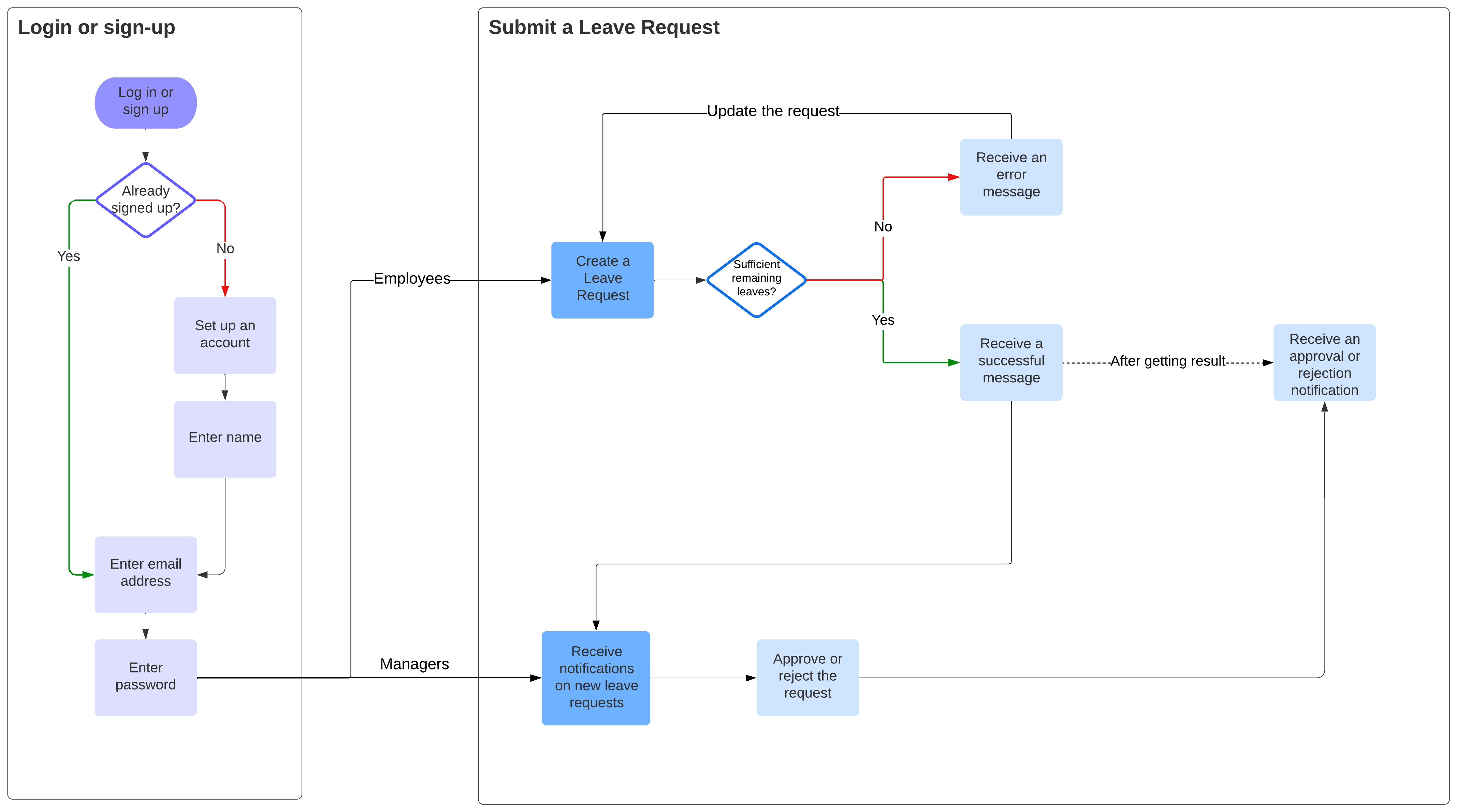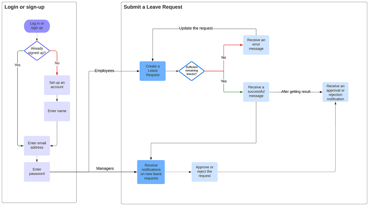 Below is a simple user flow I’ve created for the Leave Tracker App, using Lucidchart. However, you can use any preferred diagram tools, such as FlowMap, Miro, or Figjam, to visualize the user journey.