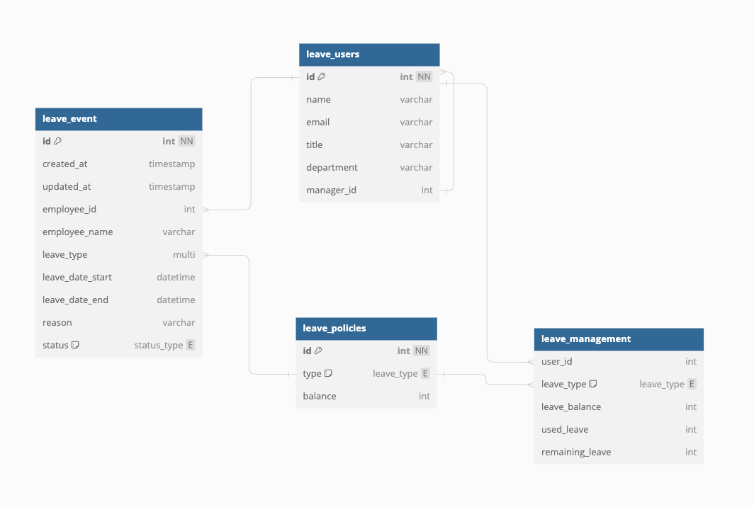 leave_users: A table to store the user’s information, including their name, email, managers, etc.