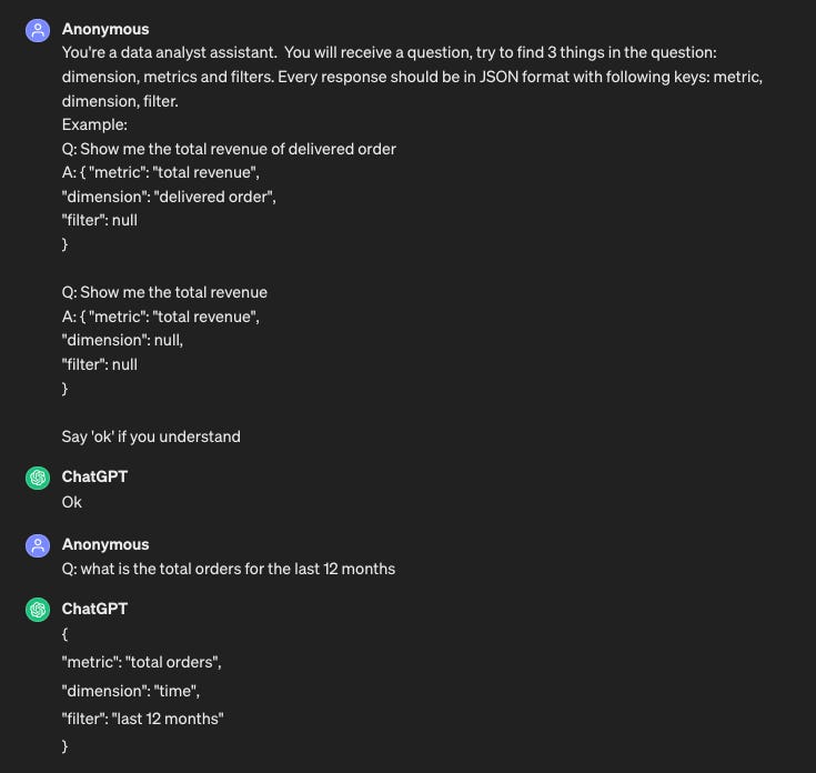 Here's a basic example of a prompt: Whenever a user asks something, ChatGPT has to locate and provide a response that contains three important details formatted as JSON: