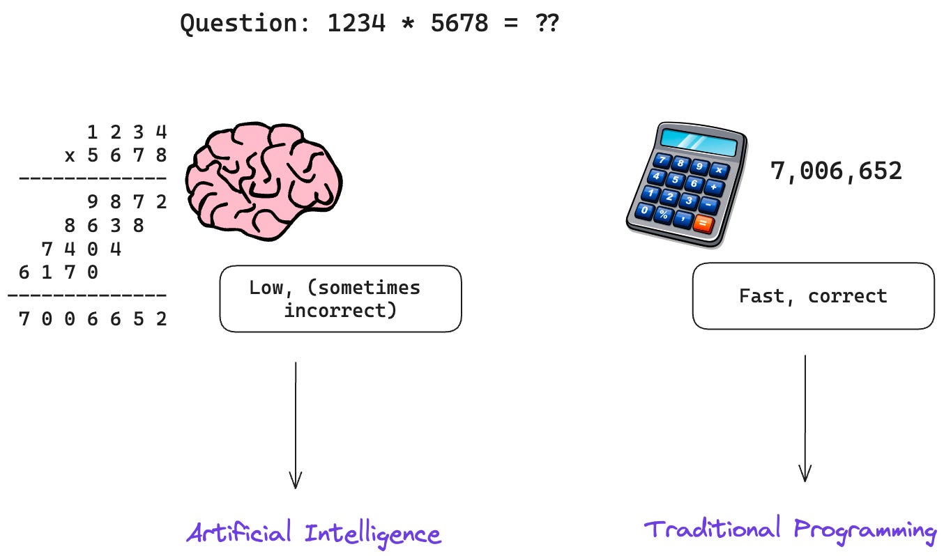 However, despite its power, AI isn't always as efficient as traditional programming when it comes to handling requests quickly and predictably. To put it simply, AI can be compared to the human brain, whereas traditional programming can be likened to a calculator. While the brain may struggle with complex and precise calculations, a calculator can perform such tasks swiftly and accurately.