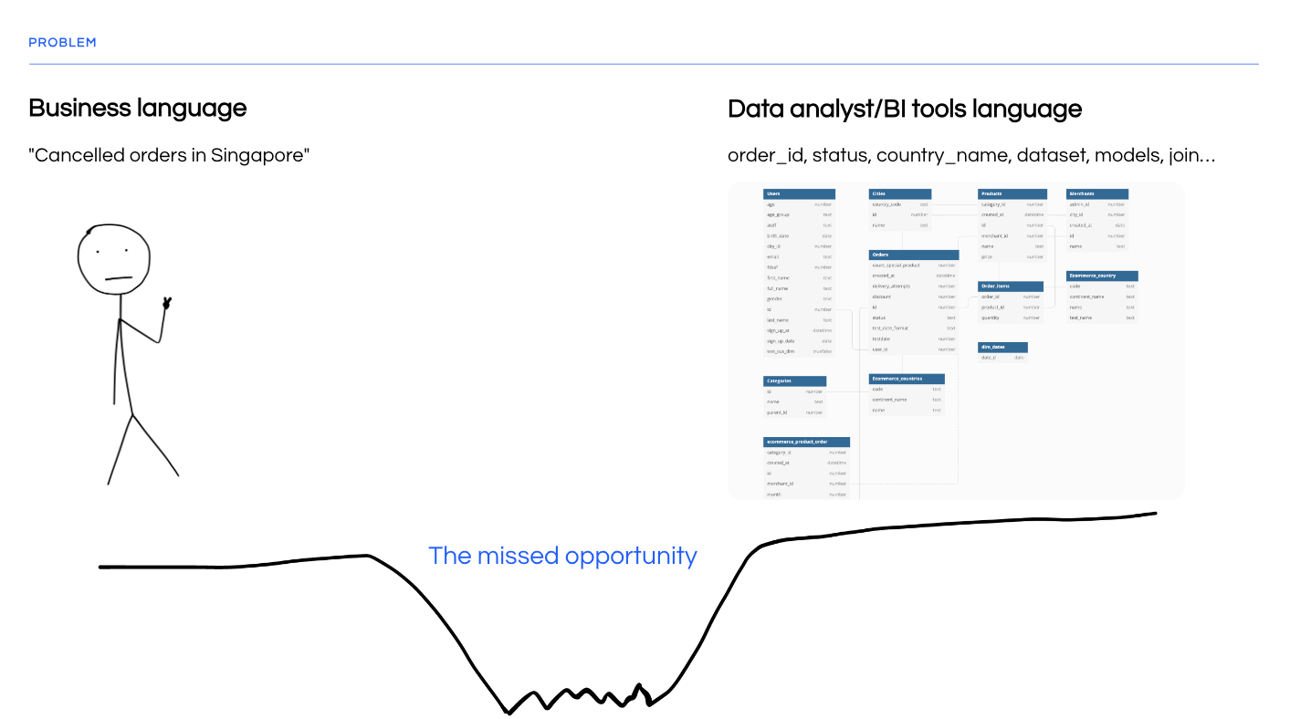 For instance, at Holistics, we recognized a big gap between users' Business Language (what users ask) and the Data Language (what a BI tool can answer). This disconnect often led to users struggling to find the information they needed without a deep understanding of the tool or their organization's data structure, potentially reducing user adoption.
