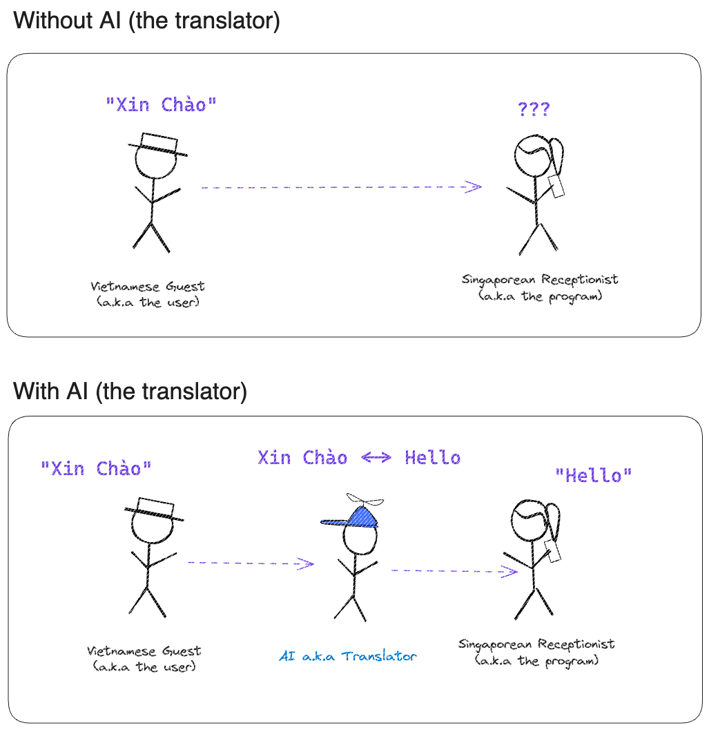 In this analogy, AI functions as the translator, bridging the communication gap between the Vietnamese (users) and the waiter (traditional programming).